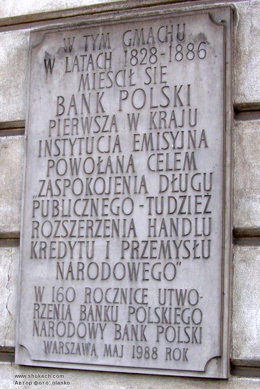 В цьому будинку у 1828-1886 роках розміщувався Банк Польщі – перша емісійна установа в державі, яка створила умови для надання кредитів, розвитку торгівлі і промисловості.