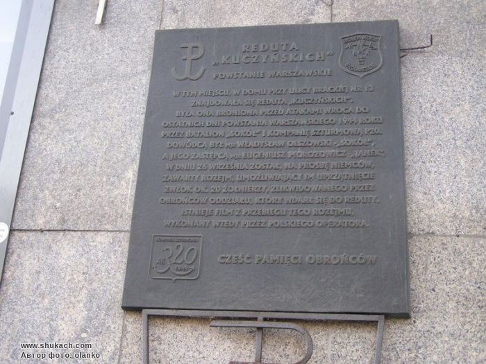 У цьому місці, в будинку на вулиці Брацька, 13 був редут «Кучинських». Його захищали від ворожих нападів до останніх днів Варшавського повстання 1944 року батальйон «Сокіл» і штурмова рота Р20. Командиром був майор Владислав Ольшовський – «Сокіл», а його заступником був майор Євгеніуш Морозович – «Янек».