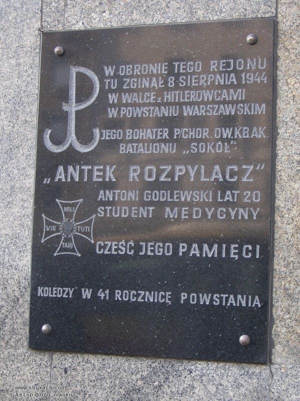 Боєць Варшавського повстання, 20-річний студент-медик Антоній Годлевський загинув 8 серпня 1944 року в цьому районі в бою з німецькими окупантами. Дошка встановлена у 1985 році.