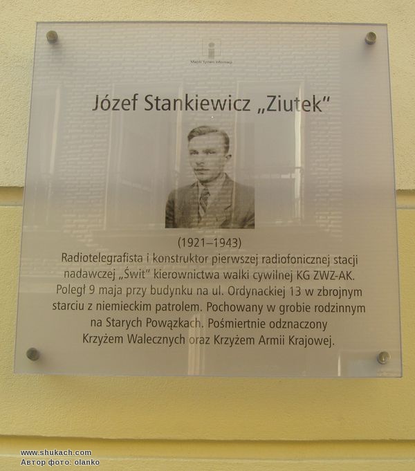 Встановлена на честь радіоконструктора і учасника опору Юзефа Станкевича, який в цьому місці загинув 9 травня 1943 року у сутичці з німецьким патрулем. Дошка урочисто відкрита в день 100-ліття з дня його народження 15 листопада 2021 року.