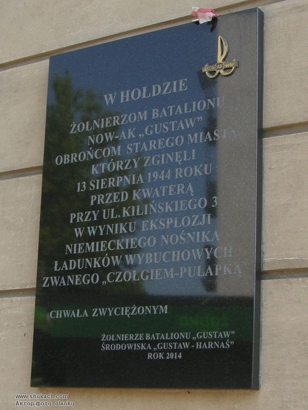 «Вшановуючи пам’ять бійців батальйону NOW-AK «Густав», захисників старого міста, які загинули 13 серпня 1944 року перед кварталом на вул. Kilińskiego 3 внаслідок вибуху німецького носія вибухівки під назвою «танк-пастка».