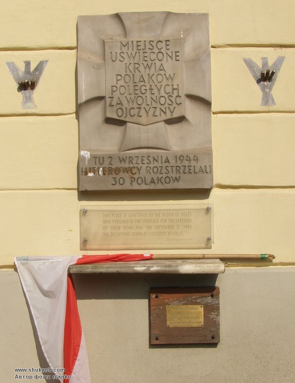 Текст: «Місце, освячене кров’ю поляків, які полягли за свободу Батьківщини. Тут 2 вересня 1944 року фашисти розстріляли 30 поляків».
