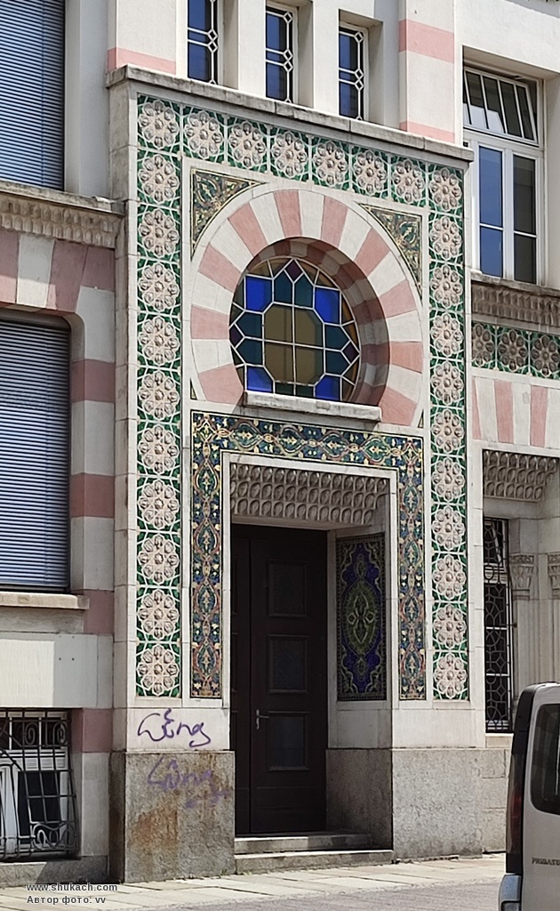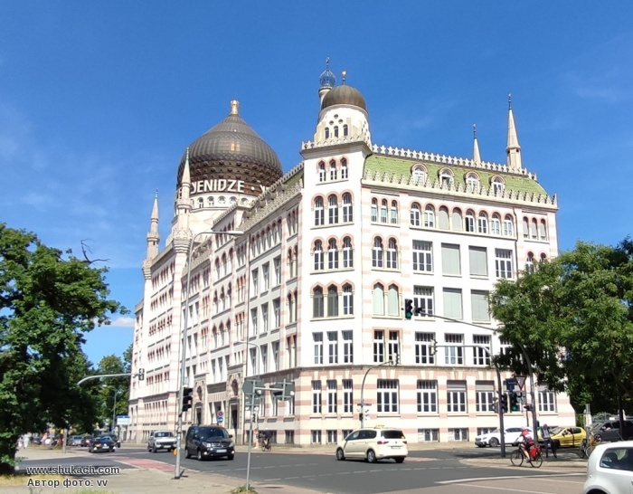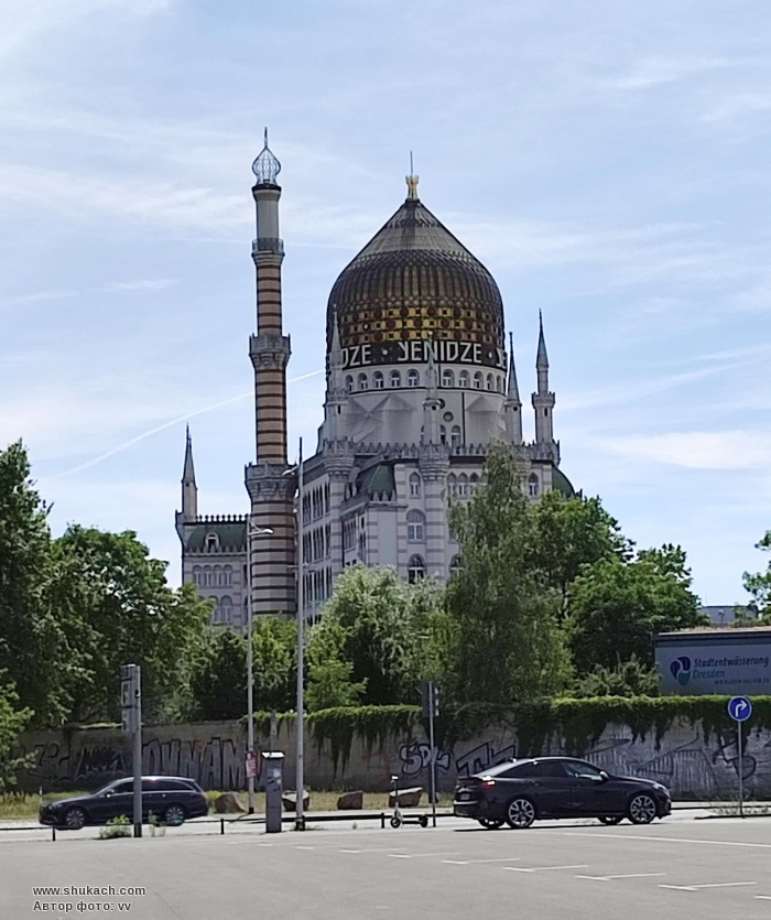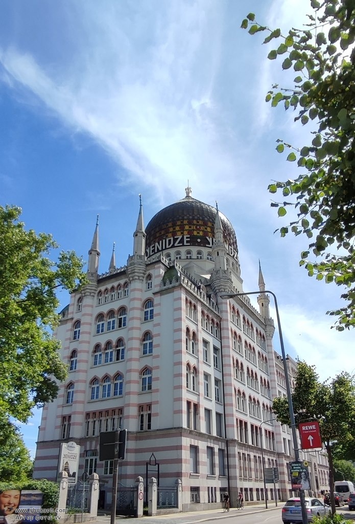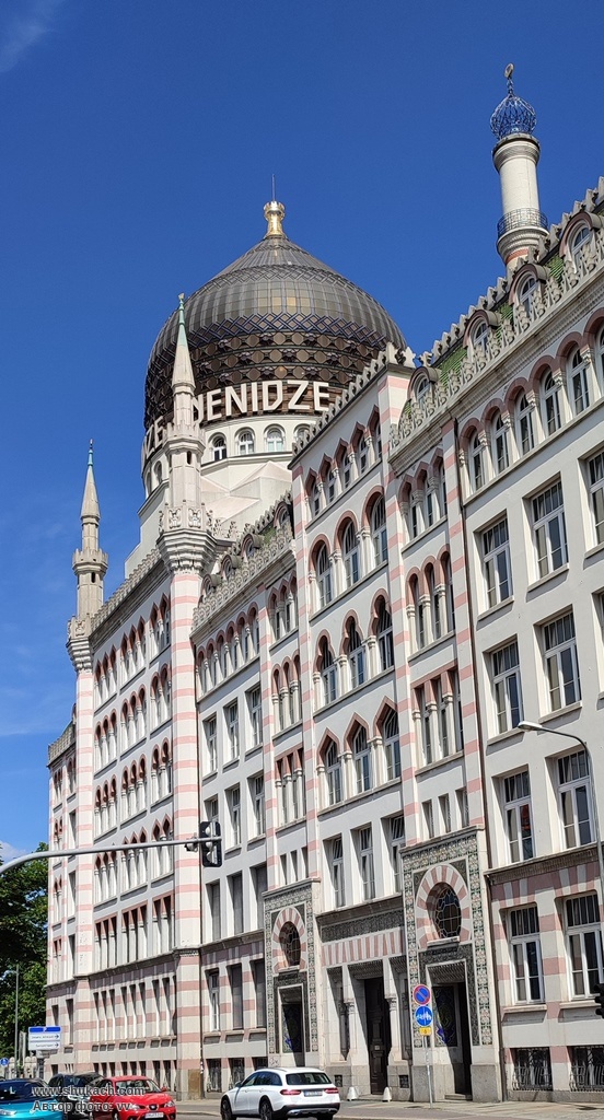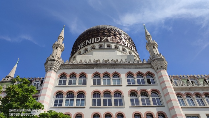 На початку 20-го століття в Дрездені існувала постанова не зводити жодної фабричної будівлі, яка була б розпізнаною як така в районі навколо центру, до якого ця територія належала. Це одна з причин, чому Зітц хотів звести орієнталізаційну будівлю неподалік від центру Дрездена, яка, з одного боку, відповідала цій вимозі, а водночас мала бути пам’ятним рекламним пам’ятником його фабриці східного тютюну та сигарет «Єнідзе» . За пропозицією Зітца, архітектор, а пізніше зять Гітлера , Мартін Хамміч, спроектував будівлю в оригінальному «східному» стилі з куполом із кольорового скла та замаскований димар мінарету, що зовні виглядає як мечеть . Зразком для будівництва була мечеть-гробниця еміра Хайр Бака в Каїрі. У Дрездені, новобудова в стилі абсолютно чужої, ще дуже маловідомої культури зустріла бурхливе неприйняття