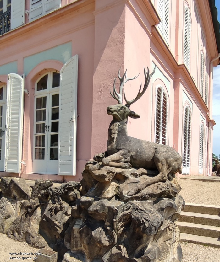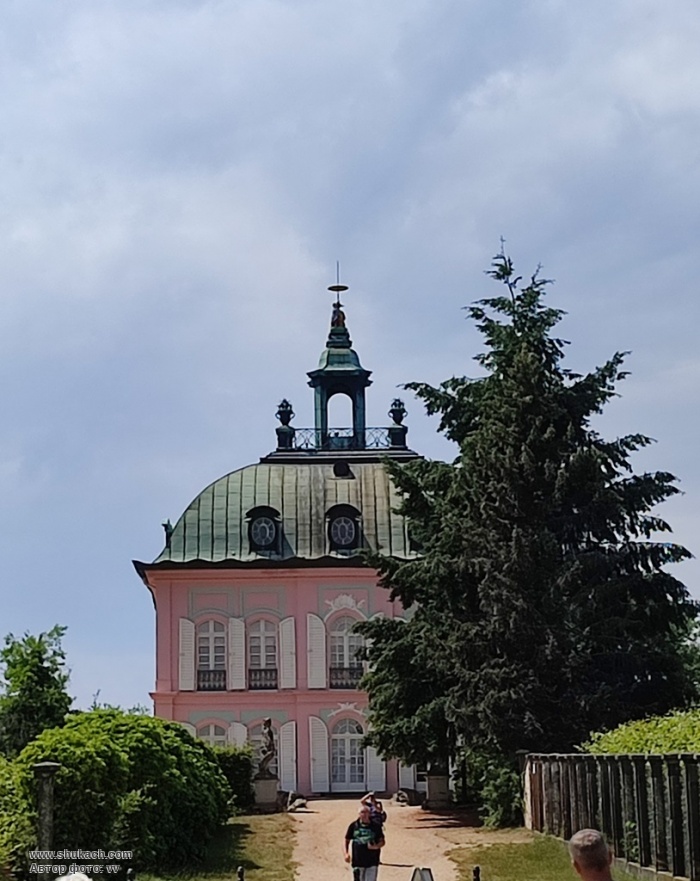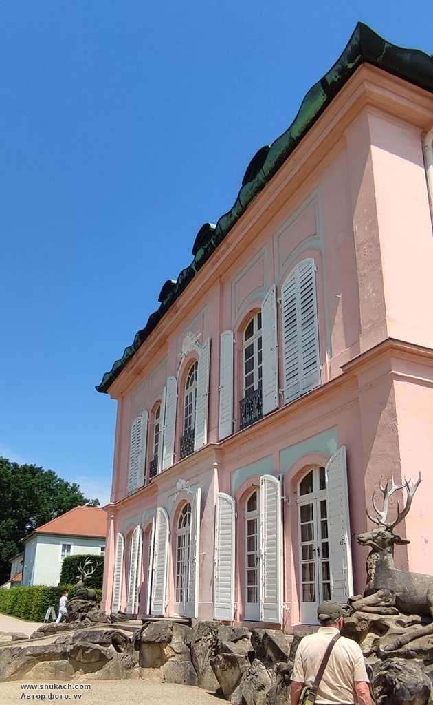Замок фазанів був побудований у стилі рококо з елементами архітектури бароко придворним архітектором Йоганном Даніелем Шаде та Йоганном Готлібом Гауптманом між 1769 і 1782 роками. Fasanenschlösschen — це квадратна двоповерхова будівля. З південного та східного боку є барокові сходи. Стежки, що ведуть до замку фазанів, супроводжують фігури з пісковика. На даху мандарин киває під час вітру.