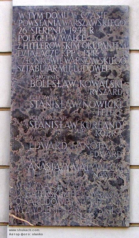 Під час Варшавського повстання будівля була штабом Варшавського округу Армії Людової. 26 серпня 1944 року внаслідок бомбардування кам'яниця була зруйнована. Під завалами загинули окружний комендант Болеслав Ковальський пс. «Ришард», Станіслав Новицький пс. «Фелікс», Едвард Ланота пс. «Едуард» та Анастазі Матівецькі пс. «Настек». Про них нагадує меморіальна дошка, відкрита в 1954 році.