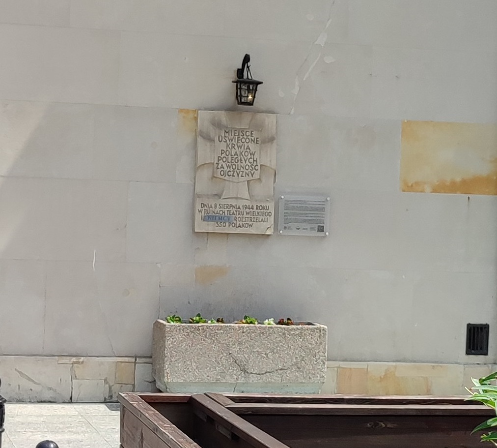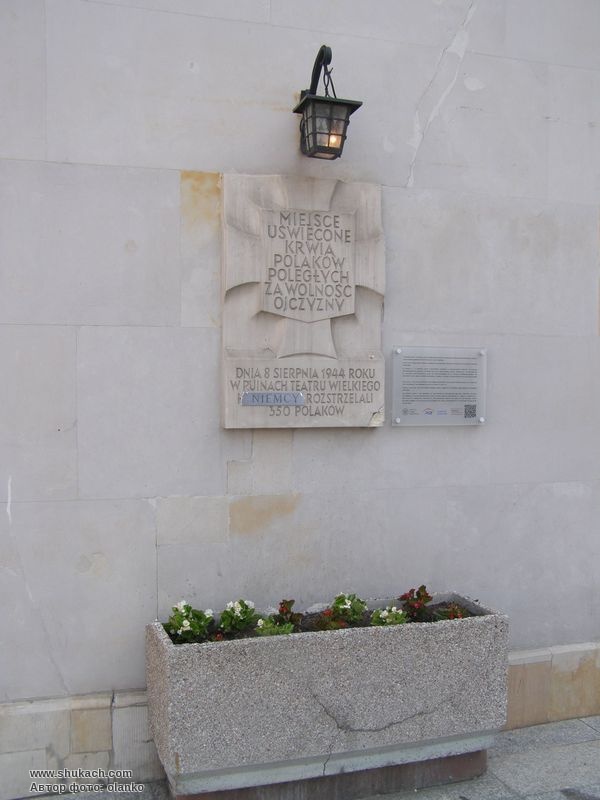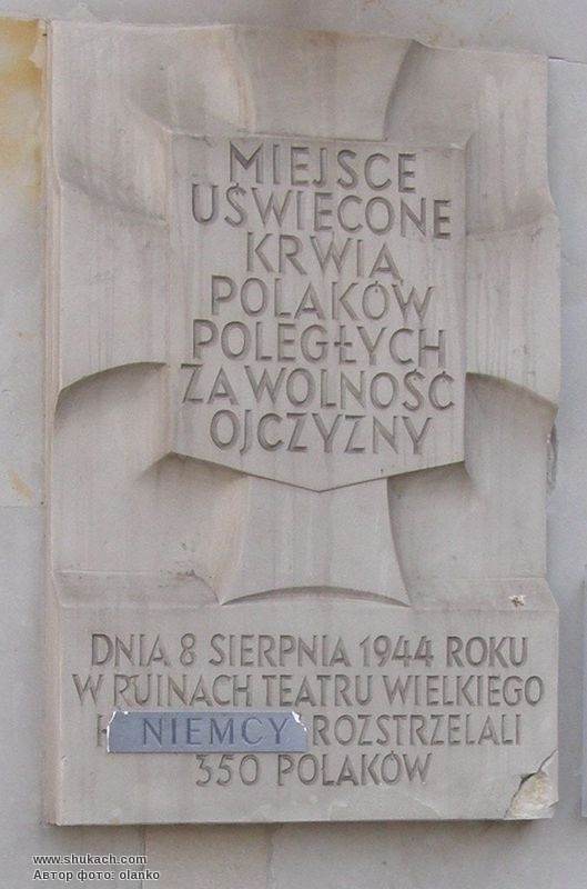 Текст: «Місце, освячене кров'ю поляків, які загинули за свободу своєї батьківщини. 8 серпня 1944 року на руїнах Великого театру нацисти розстріляли 350 поляків».
