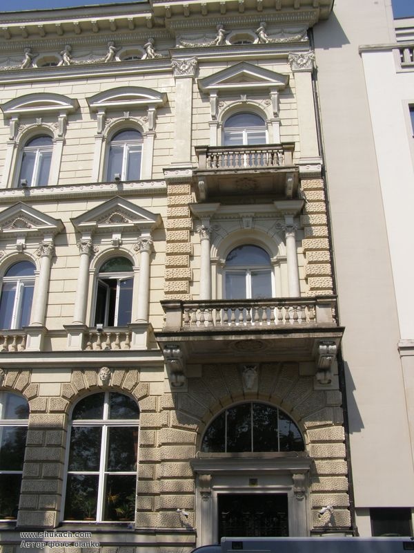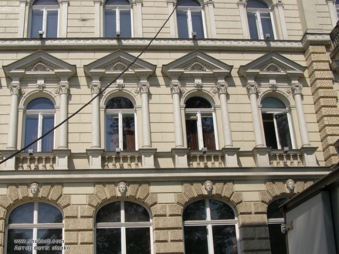 Високий постамент будівлі разом з першим поверхом був покритий рустикальними зерненими дошками. У вікнах підвалу вміщено декоративні решітки, а в західному ризнищі розміщено надбрамний проїзд. Вхідний отвір був обладнаний залізними дверима з кованими ґратами. Усі віконні прорізи мають напівкруглі закриття. Замкові камені вікон першого поверху прикрашені жіночими масками, вікна першого поверху мають обрамлення у вигляді едикул з композиційними колонами та трикутними фронтонами, тимпани яких заповнені мотивами черепашок. Віконні прорізи цього поверху, оздоблені по краях рустикою з клапотями, мали розширені прорізи й обладнані балконами з балясинами-балюстрадами. Стіни були вкриті рустовими плитами. Вікна з трикутними фронтонами, вбудовані в ризаліт другого поверху, отримали такі ж балкони. Інші вікна цього поверху отримали фронтони у вигляді сегментів кола. Широка смуга фриза під виступаючим вінчаючим карнизом розділена багатьма прорізами. Міжвіконні поля були заповнені мотивами фестонів і гірлянд.