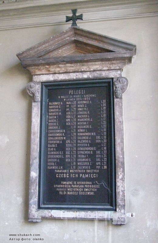 Встановлена на фасаді костелу Всіх святих в пам'ять парафіян, які загинули у 1914-1920 роках. «Полеглим у боротьбі за віру і Батьківщину». Дошка встановлена з ініціативи парафіяльного священика доктора отця Марцелія Годлевського.