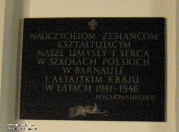 Текст: «Засланим вчителям, які сформували наш розум і серце у польських школах в Барнаулі і Алтайському краї у 1941-1946 роках».