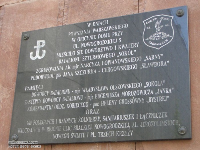У дні Варшавського повстання у 1944 році у флігелі будинку № 5 по вул. Новогродзькій розміщувалось керівництво і підрозділи батальйону «Сокіл», який тримав оборону на барикадах вулиць Новогродзької, Брацької, Нового Святу і площі Трьох Хрестів. Батальйон в боях втратив близько 100 бійців загиблими і пораненими.
