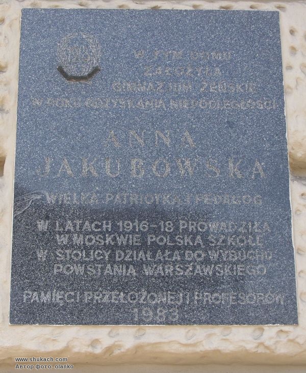 Текст: «У цьому будинку у рік відновлення незалежності заснувала дівочу гімназію Анна Якубовська, велика патріотка і педагог. У 1916-1918 роках керувала польською школою у Москві, в столиці діяла до початку Варшавського повстання».