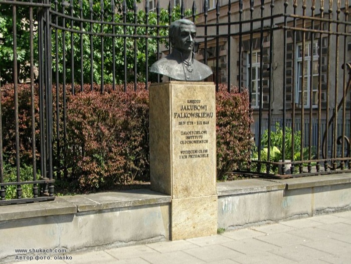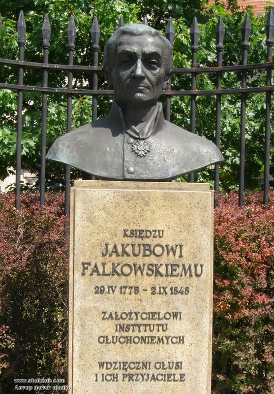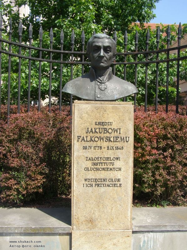 Погруддя преподобного Якуба Фальковського (1775-1848), священика з ордену піаристів, педагога і опікуна глухонімих і засновника місцевого інституту, поставлене на високий постамент перед Інститутом глухонімих. Автори пам'ятника – Станіслав Сипош та Ришард Стриєцький. Урочисте відкриття та освячення відбулося 23 жовтня 2002 року кардиналом Юзефом Глемпом.