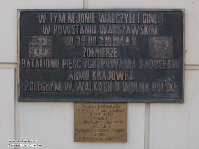 Це бронзова меморіальна дошка, розташована на передній стіні будівлі за адресою Plac Trzech Krzyży 3. У тексті йдеться: «У цьому регіоні бійці батальйону «Кулак» групи «Радослав» АК воювали і загинули під час Варшавського повстання з 3.9. по 2.10.1944 року. Полягли у боях за вільну Польщу. Друзі». Урочисте відкриття відбулося 10 вересня 1989 року. Поруч невелика табличка, яка доповнює інформацію: «Солдати цього батальйону після боїв у Волі, Муранові та Старому місті вирушили до Південного Середмістя і як взвод секції «Богуміл» захищали площі 3 Кшижи та Ксьонджека».