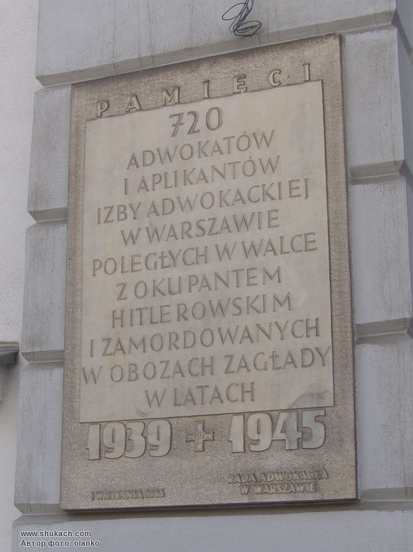 Текст: «Пам'яті 720 адвокатів та стажерів Варшавської колегії адвокатів, які загинули у боротьбі з нацистськими окупантами і в таборах знищення в 1939-1945 рр.».