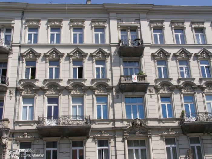 Зведена в 1900 році за проектом Адама Очковського в стилі необароко. Характерною особливістю прибуткового будинку є два кутових балкона, які спираються на голови двох левів, і декоративні тимпани над вікнами.