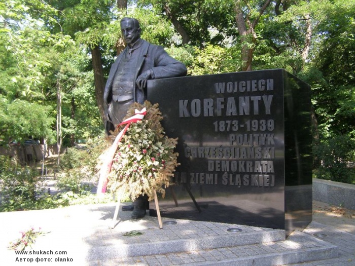 Встановлений на честь Войцеха Корфантого, польського національного лідера Верхньої Сілезії. Автор – скульптор Кароль Бадина. Пам'ятник був виготовлений з патинованої бронзи і зображує Войцеха Корфантого, підтримуваного постаментом (припущення автора має символізувати, що Войцех Корфантий за життя ніколи не був поставлений на постамент). На ньому є напис: «Войцех Корфантий 1873–1939, політичний діяч, християнський демократ».