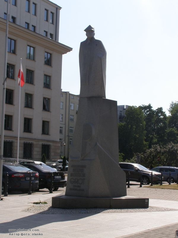 Робота Збігнєва Мікєлевича (скульптура) та Пшемислава Дудзюка (архітектура) у співпраці з Юстиною Гождзевич. Скульптура, висота якої перевищує шість метрів і вага близько 30 тон, була виготовлена зі шведського граніту в студії Збігнєва Мікелевича в Чехоціні. З урахуванням властивостей використовуваного матеріалу автори пам'ятника взяли на озброєння геометричне спрощення тіла. На ній зображений генерал Стефан «Грот» Ровецький у шинелі та генеральському кашкеті. Скульптура виростає з високого постаменту з V-мотивом і якорем польської Бойової партії. Пам'ятник був створений з ініціативи Всесвітнього союзу солдатів Армії Крайової. Відкриття пам'ятника відбулося 11 червня 2005 року.