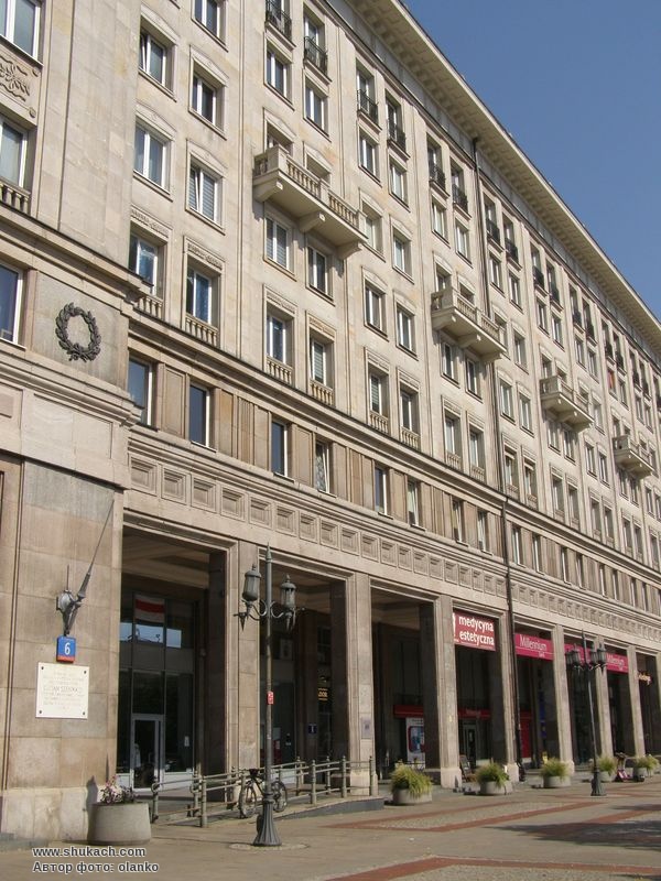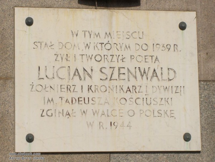 Текст: «На цьому місці стояв будинок, в якому до 1939 року жив і працював поет Люціан Шенвальд, солдат і літописець 1-ї дивізії імені Тадеуша Костюшка. Він загинув у боротьбі за Польщу в 1944 році».
