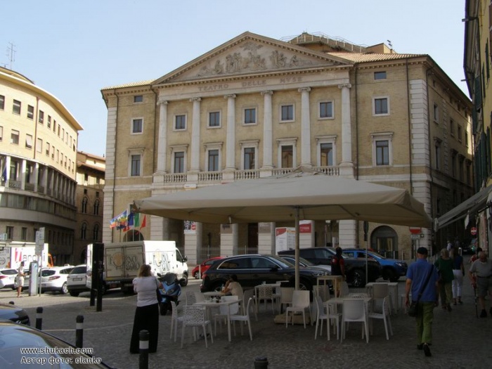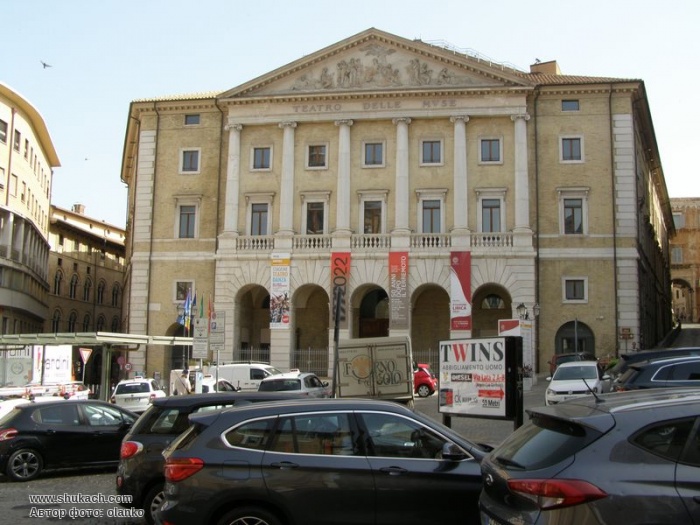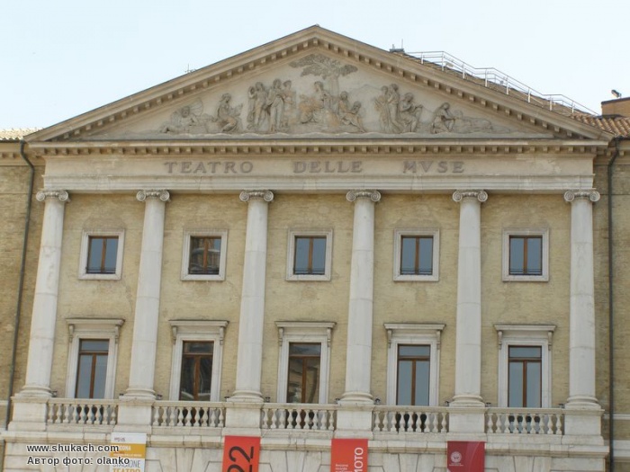 Teatro delle Muse в Анконі є найбільшим у регіоні Марке та 13-м в Італії за місткістю. Будівля в неокласичному стилі була відкрита в 1827 році і є роботою архітектора П'єтро Джінеллі. На тимпані, робота неокласичного скульптора Джакомо Де Марія, є барельєф, що зображує дев'ять муз, від яких театр отримав свою назву, Аполлона – бога мистецтв, і Палемона – бога портів. Сцена алегорично ілюструє народження театру Анкони: музи час від часу залишають свій будинок на Парнасі (який позначений на задньому плані), щоб надихнути артистів театру Анкони, розташованого на березі порту (символізується Палемоном, що притулився до корми класичного корабля).