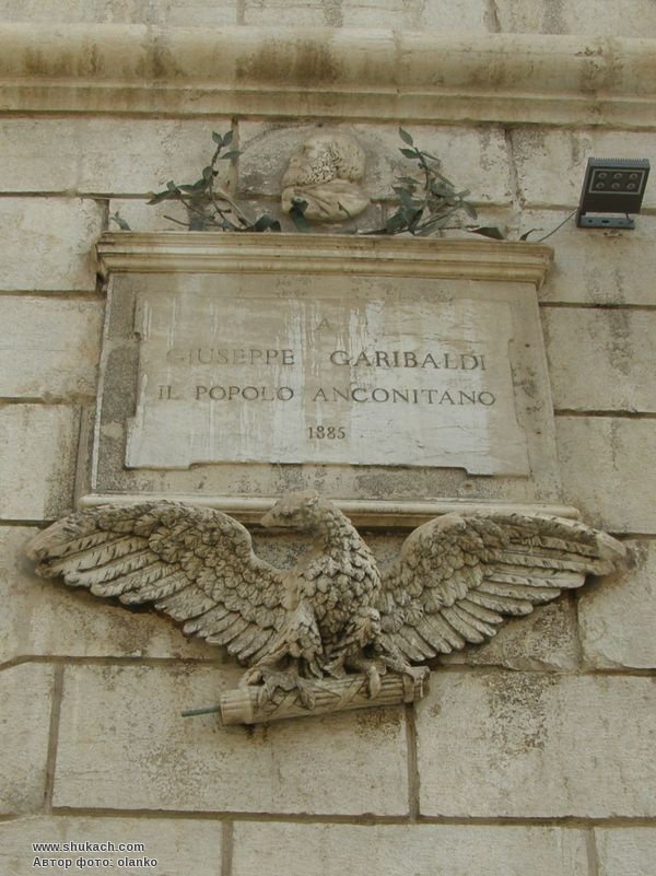 Мармурова дошка з надписом «Джузеппе Гарібальді – народ Анкони. 1885» встановлена на фасаді урядового палацу. Над нею – барельєф Гарібальді, під дошкою – скульптурне зображення орла.
