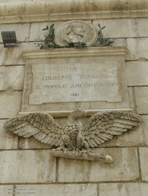 Мармурова дошка з надписом «Джузеппе Мадзіні – народ Анкони. 1885» встановлена на фасаді урядового палацу. Над нею – барельєф політика, під дошкою – скульптурне зображення орла.
