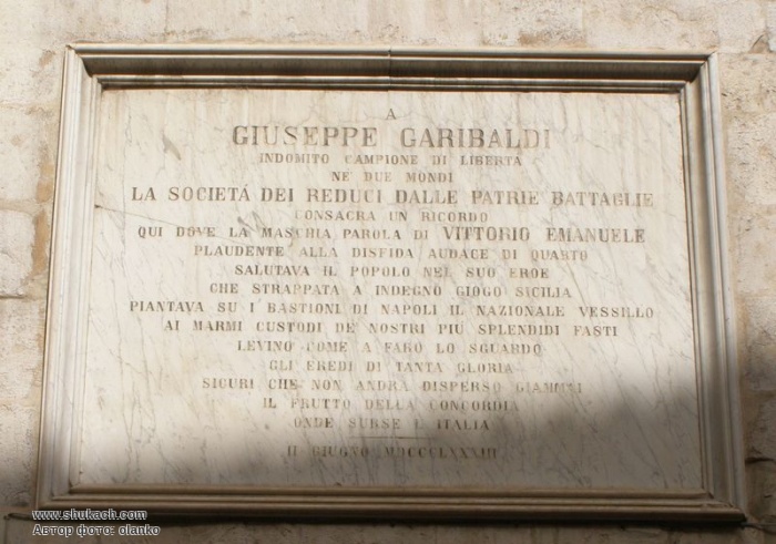 Велика мармурова дошка на честь національного героя Італії Джузеппе Гарібальді встановлена в арці урядового палацу. Урочисто відкрита 2 червня 1883 року.