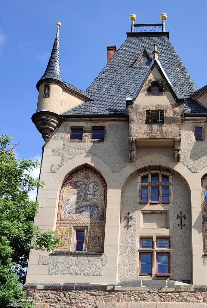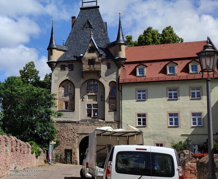 Бургтор, колишні середні ворота, перед якими був підйомний міст. Перший і верхній поверхи середньовічні (15 ст.). Конструкція даху з виступаючим машикулем і круглими кутовими вежами 1875 року за планами Отто Ванкеля . На першому поверсі, біля проїзду, пішохідна брама. Верхній поверх розділений трьома сліпими арками різної ширини з мозаїчними малюнками 1890 року (Св. Георгій та Євангеліст Іоанн) Вільгельма Вальтера.