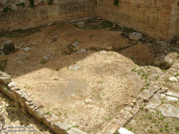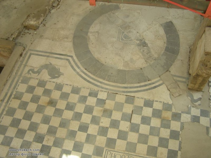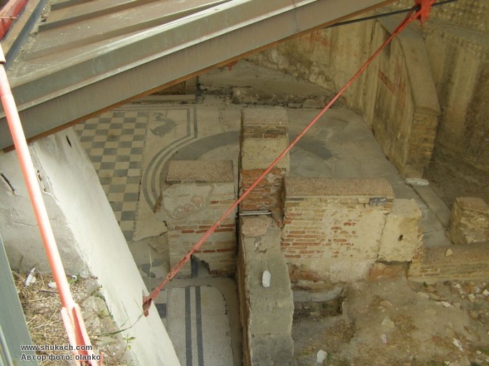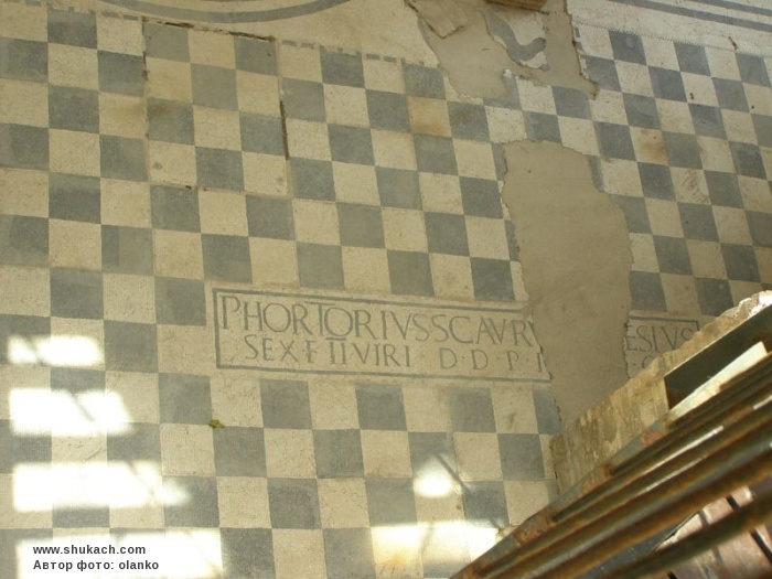 Вздовж віа Піо II видно два входи, призначені для глядачів. Натаціо, тротуари (мозаїчні, з шахівницею та фігурами дельфінів, колосоподібною та шестикутною роботою), мозаїчний напис та залишки фресок видно з похилої будівлі ліворуч від Порта-Помпе. Залишки цієї будівлі захищені сучасним навісом.