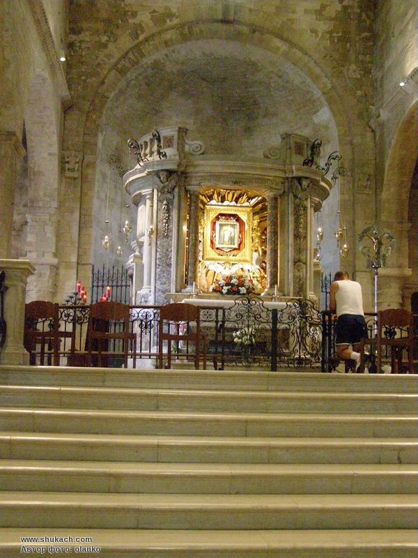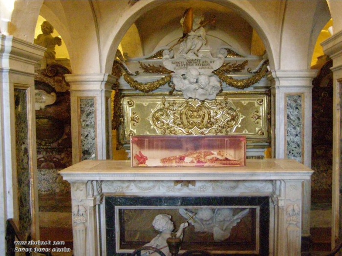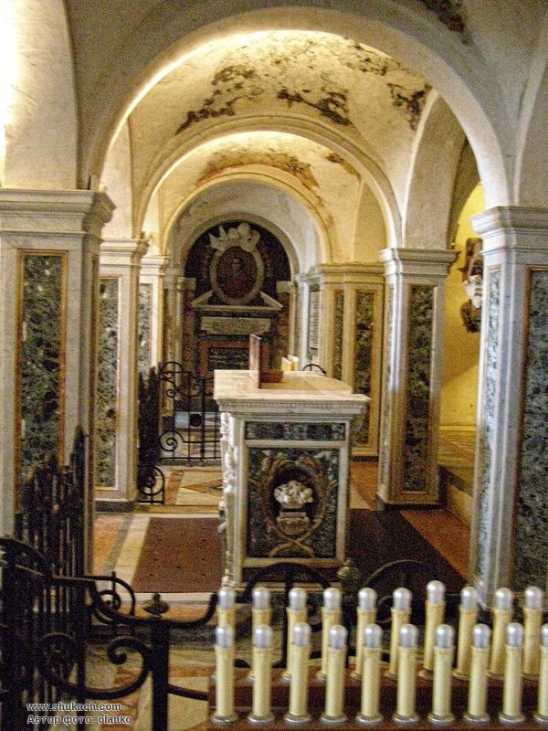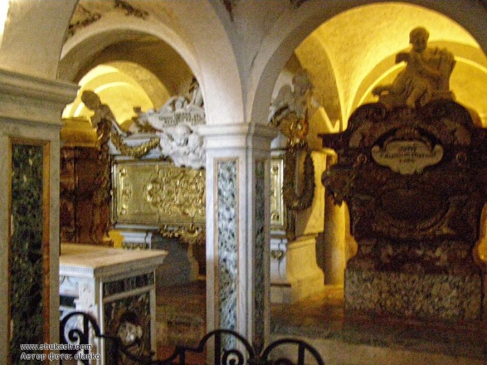 Під каплицею Мадонни знаходиться склеп з останками святого Кіріака (у мармуровому футлярі), святих Ліберія та Марцелліна (у сицилійській яшмі) та прахом святої Палатії. Урни з бронзовими гірляндами були спроектовані та виготовлені між 1757 та 1760 роками Джоаккіно Варле. У Склепі Сліз, відновленому після руйнувань Другої світової війни, знаходяться рештки стародавніх споруд.