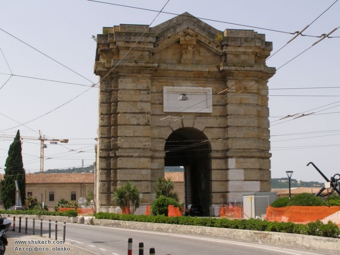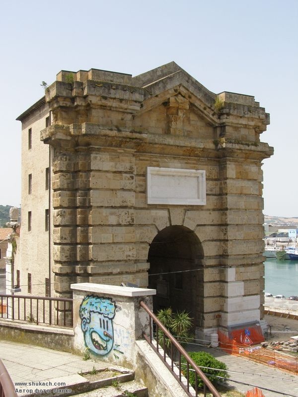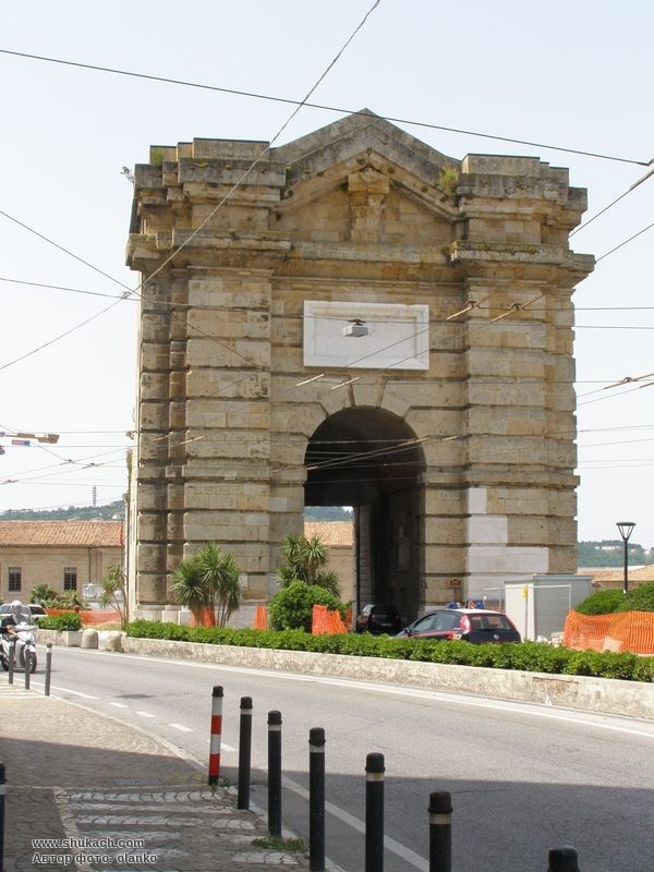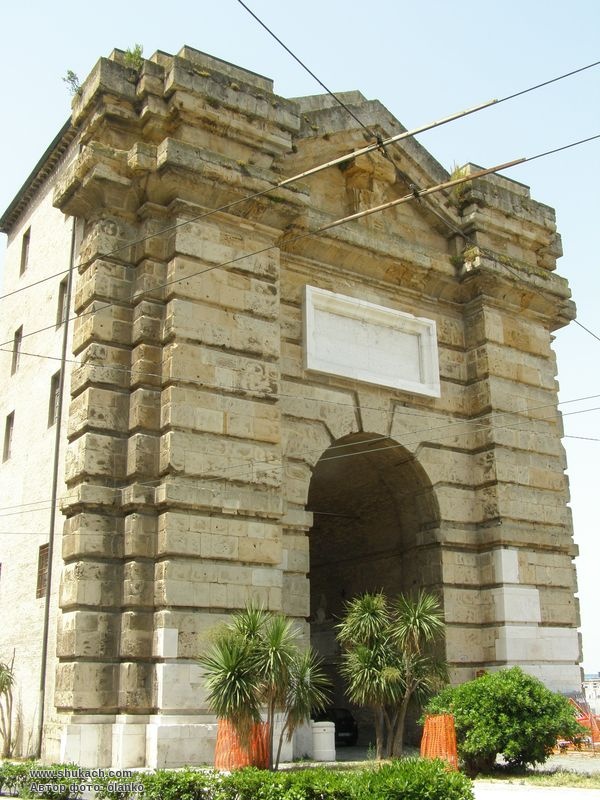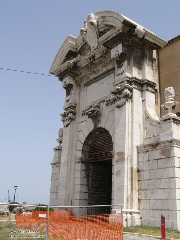 Фасад, звернений до моря, до зовнішньої сторони міста, виконаний з істрійського каменю з фризами в стилі бароко і обрамлений двома пілястрами, що підтримують склепіння, на якому була під час французької окупації 18 ст. прибрана дошка з папським гербом над нею.