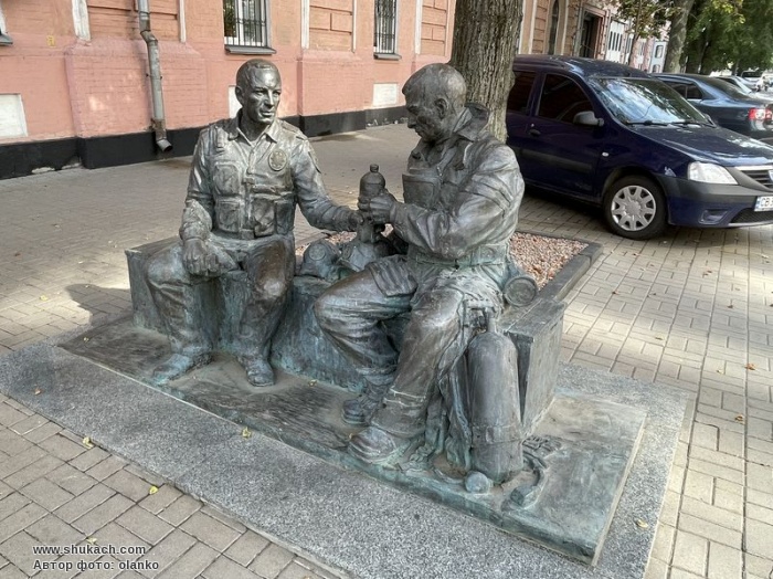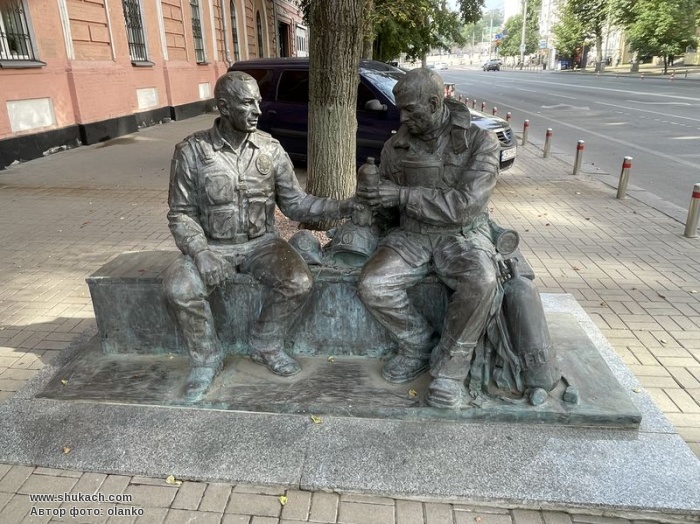 Пам’ятник розташований біля головного управління ДСНС України в місті Києві. Скульптура зображує поліцейського, який протягує пляшку води рятувальнику. Автор скульптури – Всеволод Маковій. Урочисте відкриття пам’ятника відбулось в жовтні 2021 року.