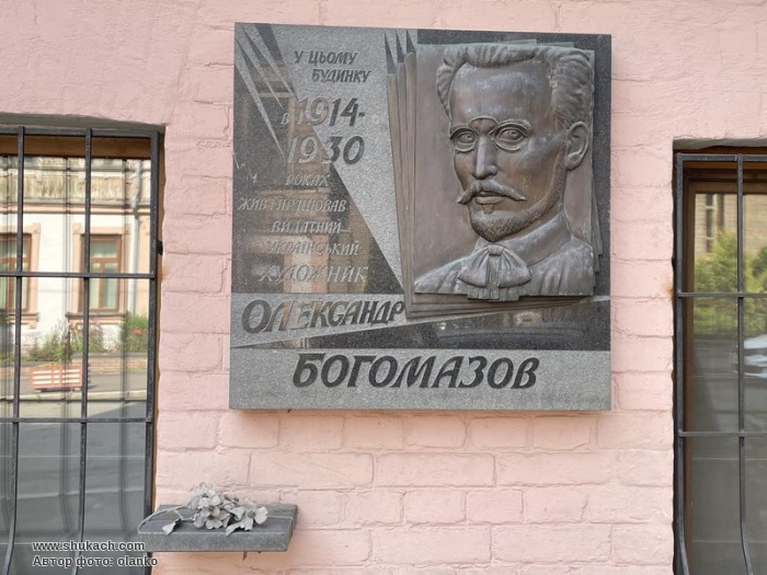 Меморіальна дошка Олександру Богомазову встановлена на фасаді будинку, де жив і працював художник у 1914-1930 роках. Вона була урочисто відкрита 19 листопада 2002 року. Сама меморіальна дошка виконана з граніту, а барельєфний портрет - з бронзи. Автори: скульптор Б. Довгань, архітектор Ф. Юр'єв.