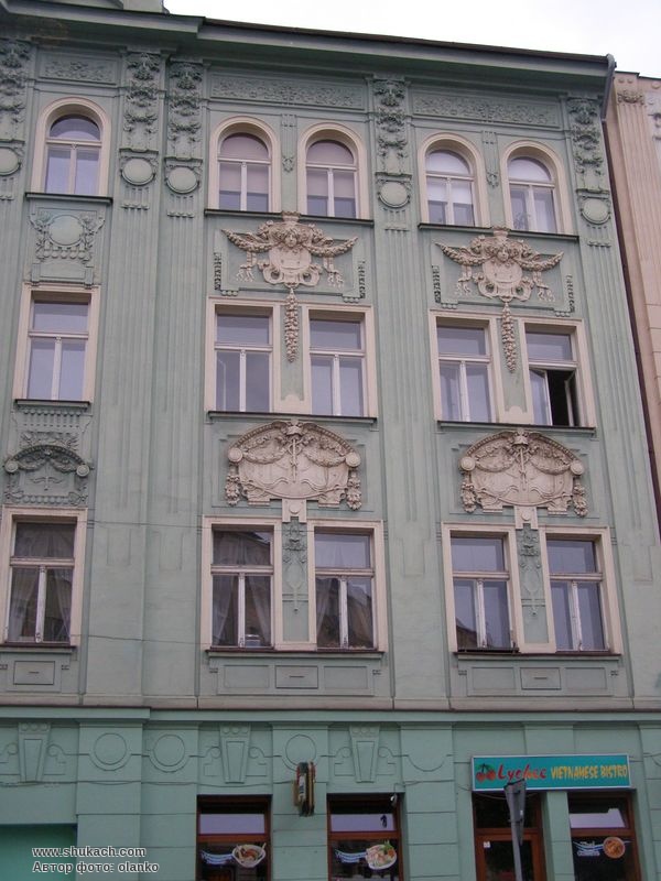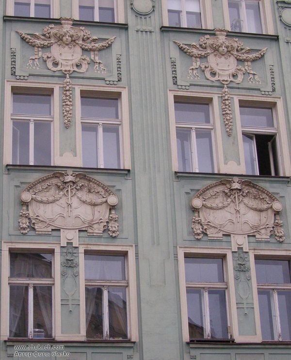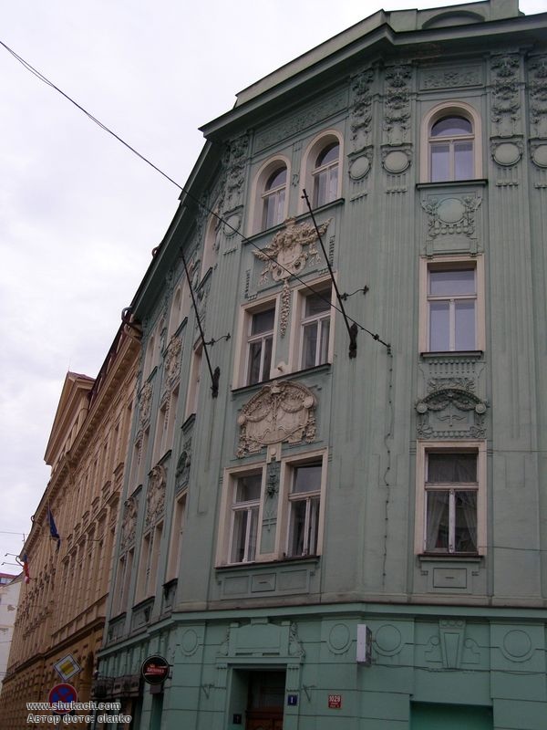 Чотириповерховий прибутковий будинок в стилі модерн зведений на розі вулиці Преслової і площі Арбеса на початку 1900-х років. Вісі розділені профільованими смугами. Фасади прикрашають великі ліпні панно із зображенням маскаронів, кадуцеєв, гірлянд і стрічок.