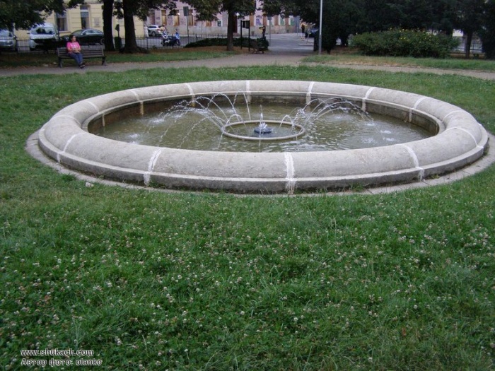 На площі розташований ландшафтний парк з лавками, посередині якого знаходиться неглибокий круглий басейн з пісковика, посередині якого знаходиться коло з нержавіючої сталі з просвердленими отворами. Вода, яка фонтанує з них, створює низькі арки води. Посередині кола вгору розбризкується більш масивний фонтан.