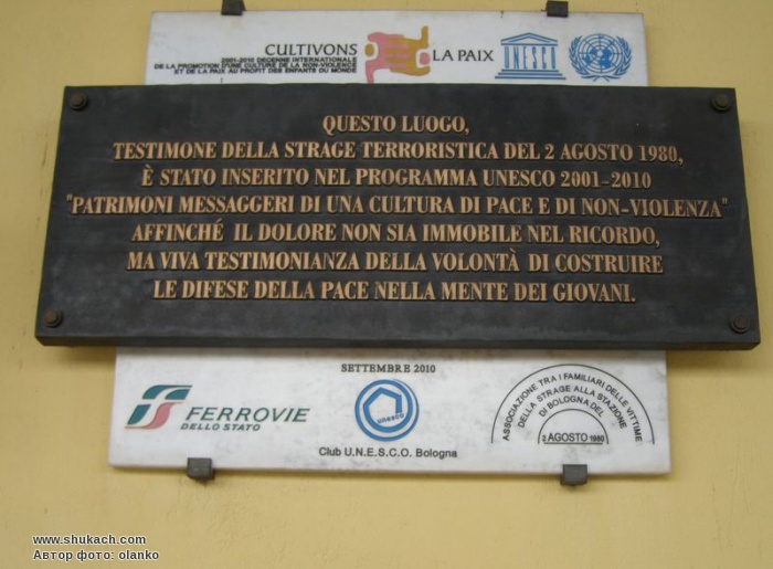 м. Болонья. Меморіальна дошка ЮНЕСКО на місці теракту 2 серпня 1980 року.