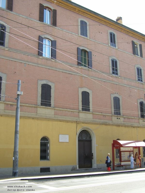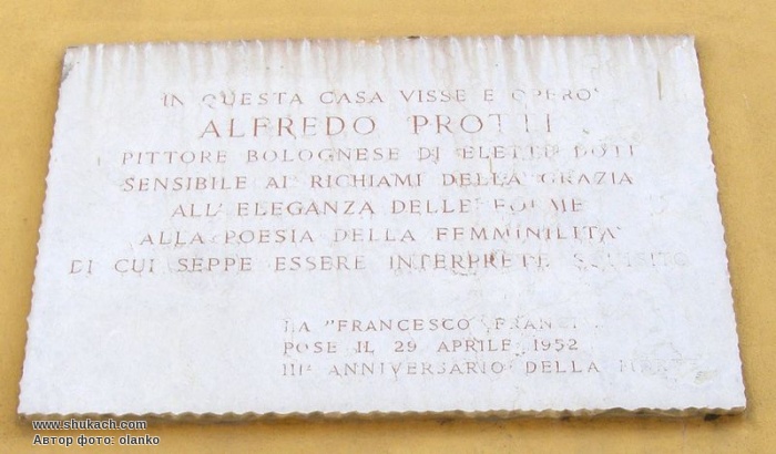 Текст: «У цьому будинку жив і творив Альфредо Протті, болонець, живописець обраних дарів, чутливий до покликів грації, до витонченості форм, до поезії жіночності, вишуканим інтерпретатором якої він був».