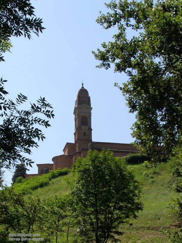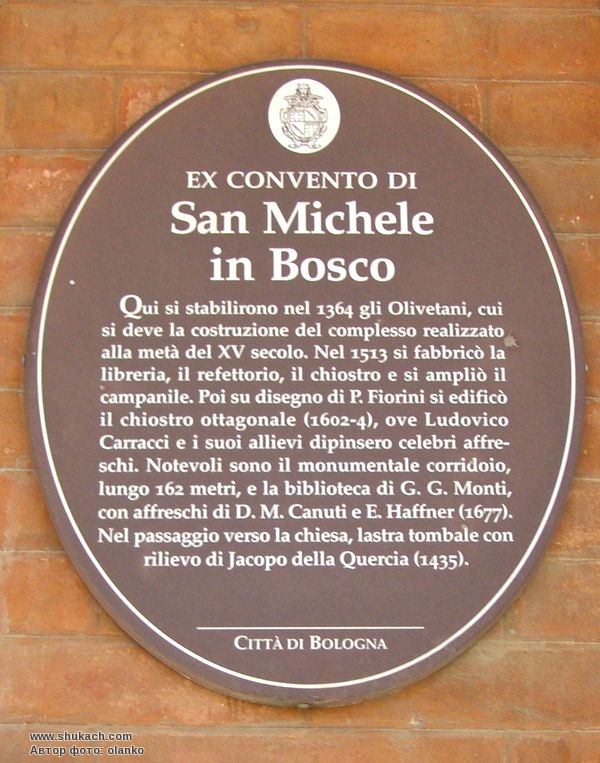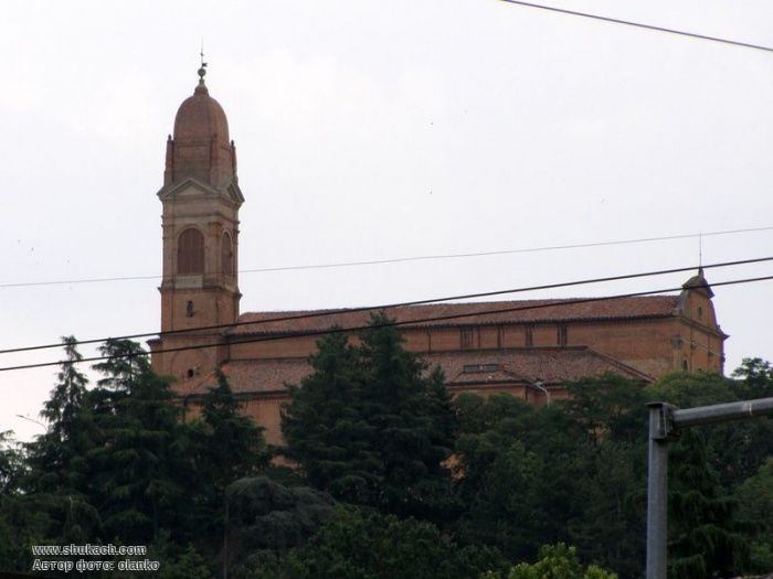 Тут, на пагорбі над Болоньєю, оселились в 1364 році ченці-оліветані, яким ми зобов'язані будівництвом комплексу, побудованого в середині п'ятнадцятого століття. У 1513 році були побудовані бібліотека, трапезна, монастир і збільшена дзвіниця. Потім за проектом П. Фіоріні була побудована восьмикутна обитель (1602-1604), де Людовіко Карраччі і його учні писали знамениті фрески. Заслуговують на увагу монументальний коридор довжиною 162 метри і бібліотека Г. Г. Монті з фресками Д. М. Кануті і Е. Хаффнера (1677). У проході до церкви надгробок з рельєфом роботи Jacopo della Quercia (1435 р.).