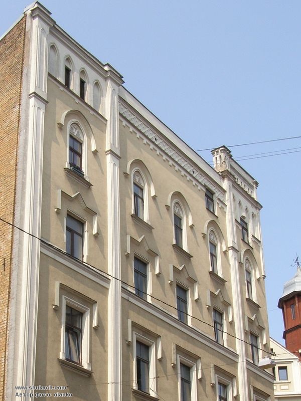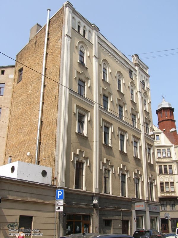 П’ятиповерховий прибутковий будинок зведений на розі вулиць Маріяс і Дзірнаву у 1900 році за проектом архітектора Генріха Девендрусса. Вікна мають часткове рельєфне обрамлення, різної форми для кожного поверху. Наріжжя завершене балюстрадою, а бічні ризаліти – вузькими стрілчастими вікнами.