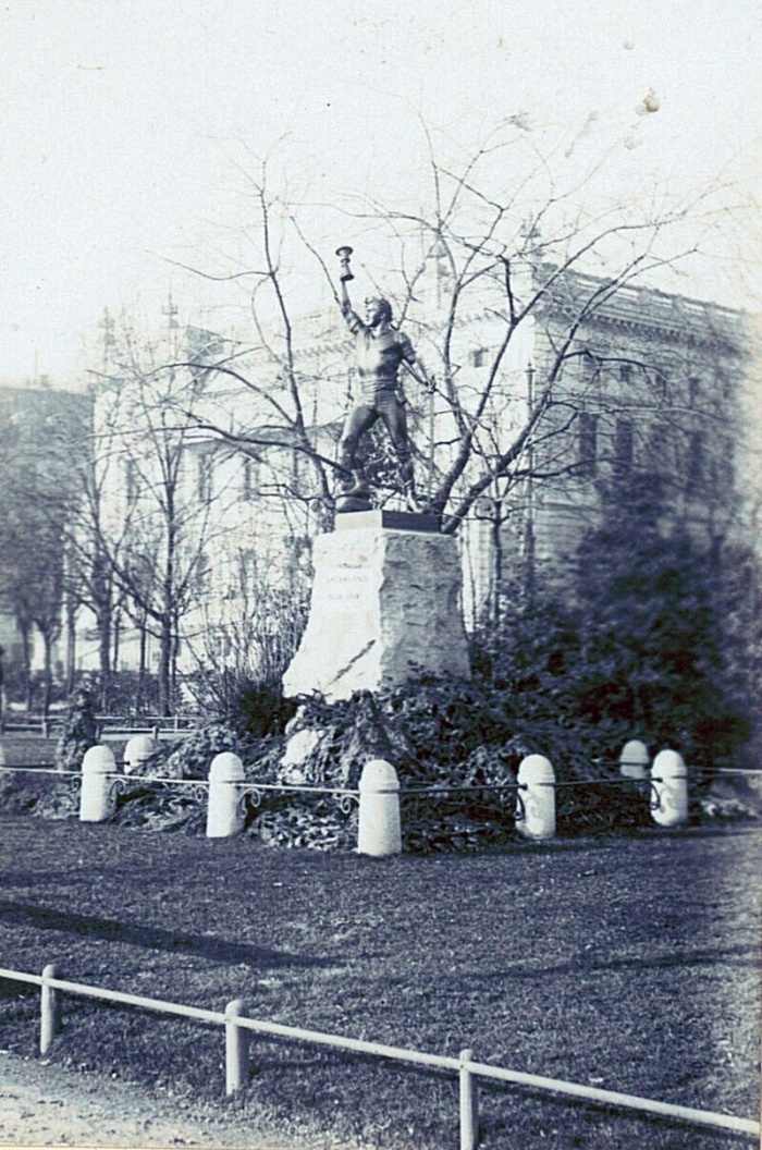 На старих фото зображений тріумфальний гімнаст, увінчаний на знак перемоги лавровим вінком. Правою рукою він піднімає в повітря завойований трофей. Його ліва рука спирається на меч, який уособлює фехтування як дисципліну «художньої гімнастики» в розумінні тих часів.