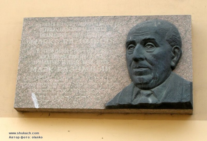Гранітна дошка з бронзовим барельєфом. Встановлена на честь єврейського прозаїка і поета Марка Разумного, який жив і творив в цьому будинку.