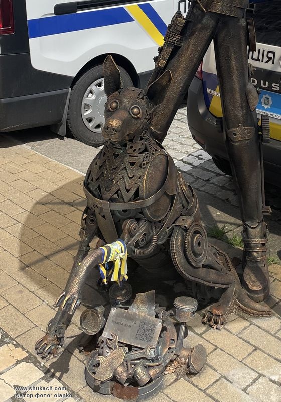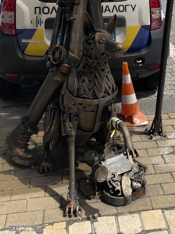 На ремені, на тій частині, що на спині напис «Поліція». Перед Вухастою Кулею тарілка з «їжею». Їжею виявилися запчастини: коленвали, ключі та диск щеплення. Покриває тарілку табличка з назвою арт об’єкта «Сталевий Коп та Вухаста Куля», місяць та рік відкриття, та QR-код, який веде на сторінку організаторів «Українська Фундація Правової Допомоги.