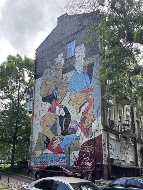 Мурал на Олеся Гончара намальований на чотириповерховому будинку. За словами кураторів фестивалю, у сплетених постатях проявляються проблеми домінування і складних ієрархічних відносин. Фігури і композиція в цілому відсилають до творчості Фернана Леже і Пабло Пікассо.