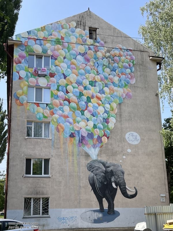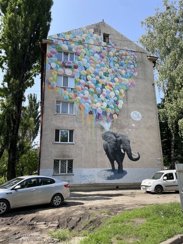 На малюнку зображений слон із великою кількістю повітряних кульок, який мріє літати, а сама робота присвячена всім мрійникам. Це один із небагатьох київських будинків, які одночасно прикрашають два мурали.