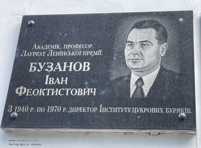 Встановлена у 2003 році на фасаді Інституту цукрових буряків НУААН на честь видатного вченого, академіка І.Ф.Бузанова, який 30 років був директором цього інституту.