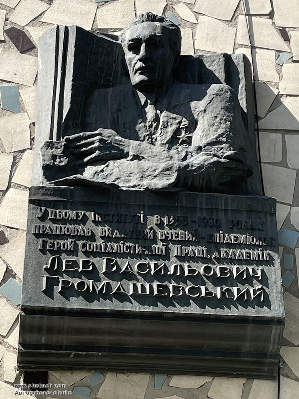 Встановлена на фасаді будівлі Інституту епідеміології та інфекційних захворювань на честь видатного вченого-епідеміолога академіка Л.В.Громашевського, який працював у цьому інституті у 1953–1980 роках. Відкрито 6 листопада 1982 року, скульптор О.К.Редько, архітектор В.Г.Смірнов.