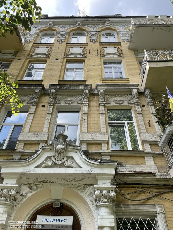 Чотириповерховий прибутковий будинок зведений у 1907-1908 роках. Фасад прикрашений різноманітною ліпниною – гірляндами, квітами, гілками. Балкони з металевими ажурними гратами. Вхідний портал аркового типу також прикрашений ліпною складною композицією. Пам’ятка архітектури.