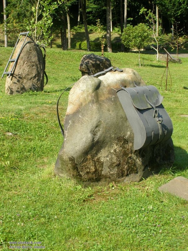 Арт-об’єкт на невеликому пагорбі включає в себе декілька ковальських робіт, що зображують сумки і наплічники, закріплені на валунах.
