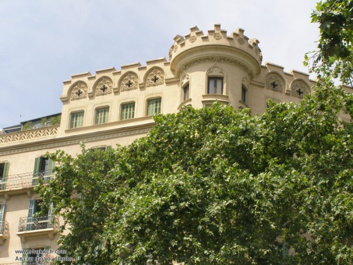 Будинок на розі вулиць святого Жоана і Алі Бея зведений в стилі модерн у 1888-1889 роках за проектом архітектора Адольфа Руїса Касамітхана. Він має наріжний елемент у формі напівкруглої вежі, яка служить шарніром між двома крилами будівлі. Є дуже помітні архітектурні деталі, такі як портал, підкреслений ганком на колонах, з квітковим орнаментом у стилі модерн. Також варто відзначити кам'яний балкон з двома жіночими фігурами – міщанки, яка грає на арфі, та ткалі.